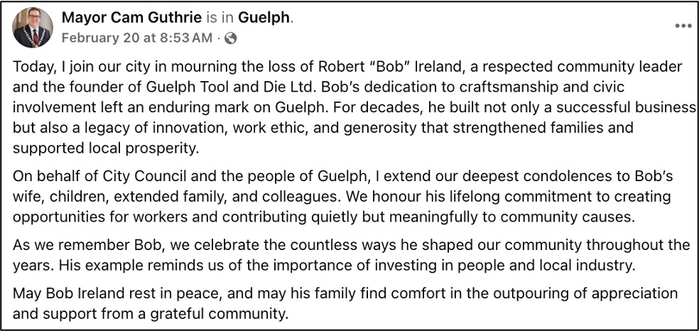 NEWS REPORT - Guelph loses a giant of industry with the passing of Bob Ireland