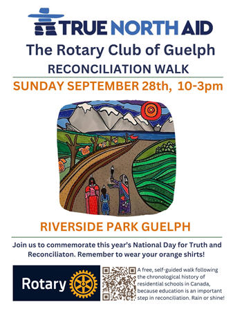 Join us to commemorate the 2025 National Day for Truth and Reconciliation. The Rotary Club of Guelph in partnership with True North Aid invites you to bring the family to our second annual Reconciliation Walk in Guelph on Sunday, September 28 @ Riverside Park. The gentle walk takes about one hour, any time between 10am and 3pm - rain or shine. It starts at the green picnic shelter. Remember to wear your Orange Shirt and bring your own water bottle (Guelph Water Truck will be on-site for free refills).