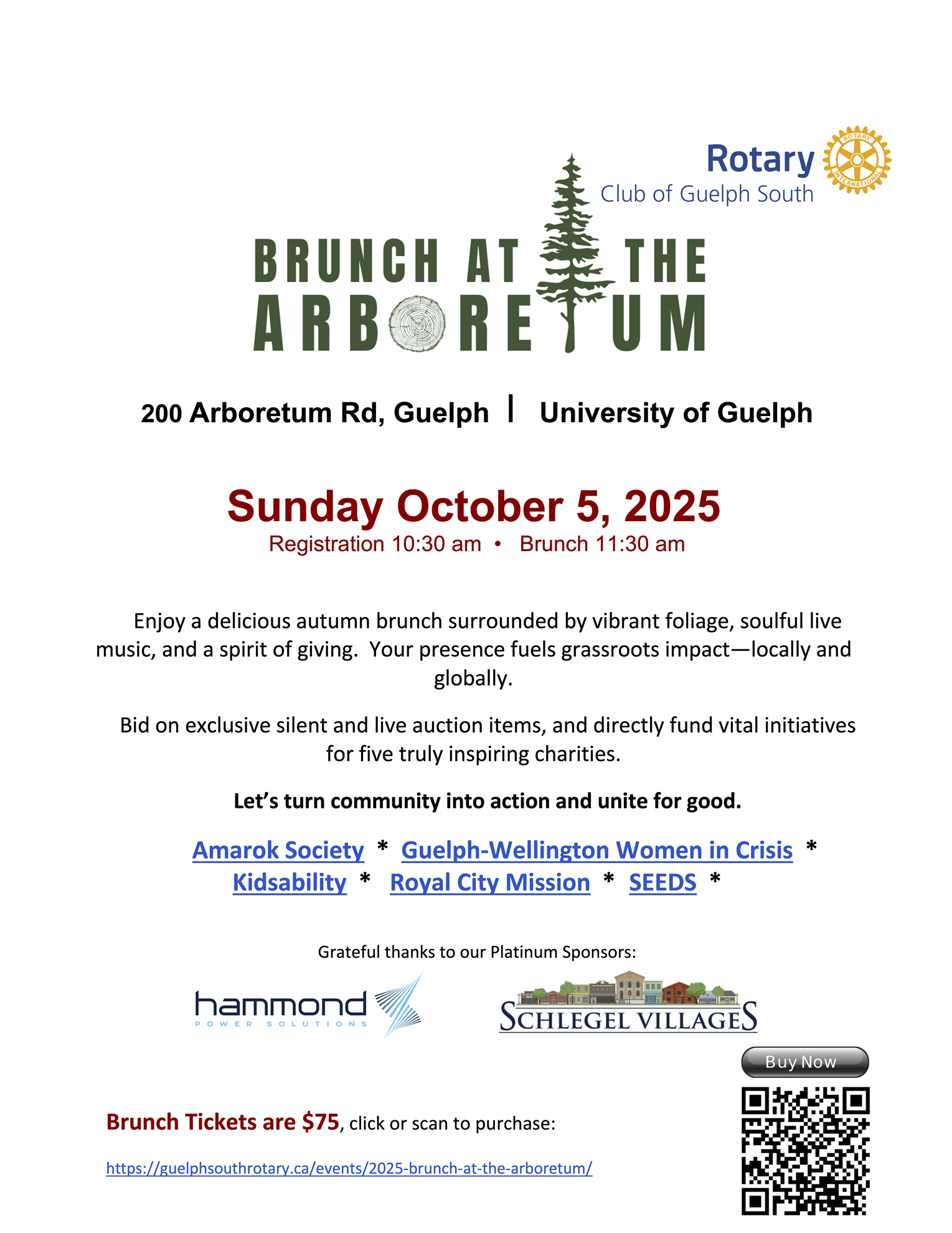 This year's Brunch at the Arboretum is almost here. Get your tickets now for a delightful gathering in support of worthy charities! The event is being hosted by the Rotary Club of Gueph South on Sunday, October 5, 2025 at the beautiful Arboretum Centre. Go here for TICKETS.