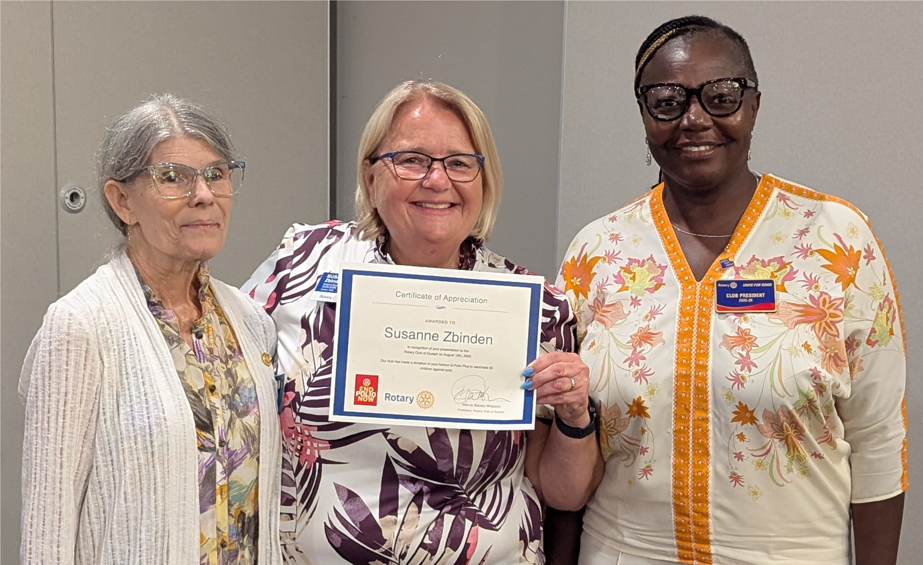 On Friday, August 15 we welcomed our District Governor for 2025-2026, Susanne Zbinden, at our club meeting, along with her husband (and fellow Rotarian) Richard Delongte. Susanne's warm presentation demonstrated the authenticity and inclusion for which she is so well known. President Marva introduced Susanne's 20-year involvement with Rotary (which can also be read HERE). Susanne shared her personal story of “Why” she is and remains a Rotarian, and encourages each of us to reflect on our own “Why” to ensure we give and get the best out of our Rotary experience. Susanne complimented our club on its amazing accomplishments over the years and encouraged the club to set its annual goals to focus on what is important to our members, the best way of retaining and engaging membership. Without directing top-down actions and measures, she encouraged flexibility and willingness to try new approaches to meet local needs as well as continue focusing on supporting Rotary internationally, especially with the campaign to End Polio.